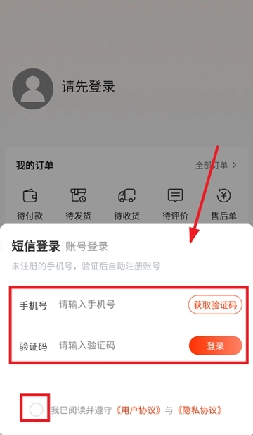 4、输入手机号与验证码,勾选“我已阅读并遵守《用户协议》和《隐私协议》”后点击登录按钮即可完成操作。若使用未注册的手机号,验证通过后系统将自动完成账号注册。