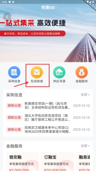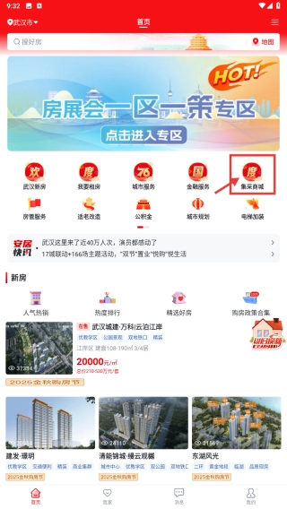 打开房产类应用,找到并点击集采商城的功能入口,即可进入集采页面。