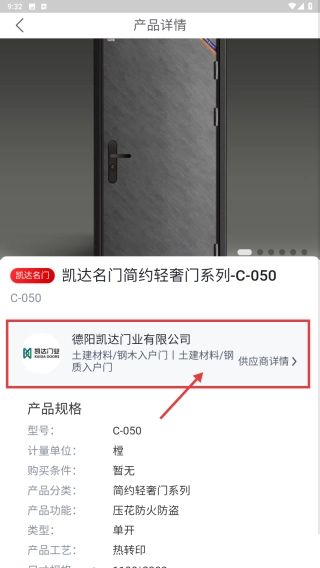 在商品列表里,找到凯达名门简约轻奢门系列-C-050这一项,点击进入产品详情页面。