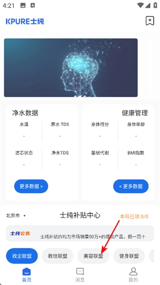 在首页,点击美容联盟,进入美容联盟相关页面。