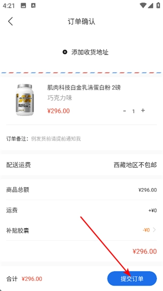 在订单确认页面,添加好收货地址后,点击提交订单按钮,即可完成订单提交操作。