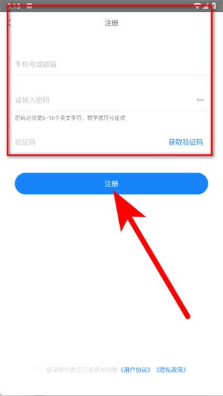 在注册界面填写手机号或电子邮箱、设置密码,获取并填写验证码,随后点击注册按钮,即可完成账号的注册流程。