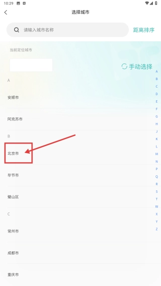 在城市选择界面,选择北京市,完成城市切换。