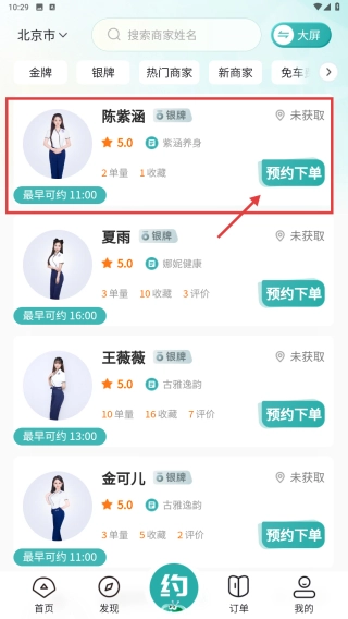 在服务人员列表里找到陈紫涵的条目,点击预约下单按钮,就能发起服务预约操作。