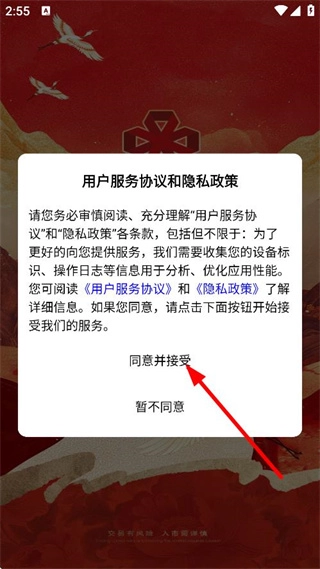 在用户服务协议与隐私政策的弹窗界面,点击同意并接受相关条款后,即可进入应用。