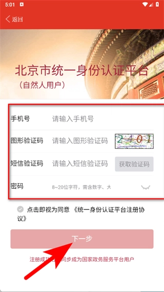 按顺序填写手机号、短信验证码和密码,之后点击下一步,即可完成注册流程。