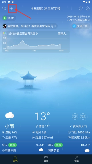 打开天气类应用后,点击界面左上角的加号图标,即可进入城市管理页面。