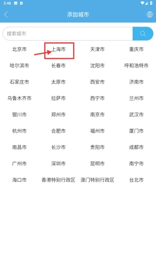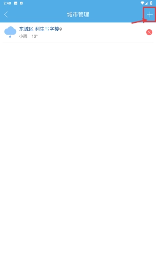 在城市管理界面,点击右上角的加号图标,即可进入添加城市的页面。