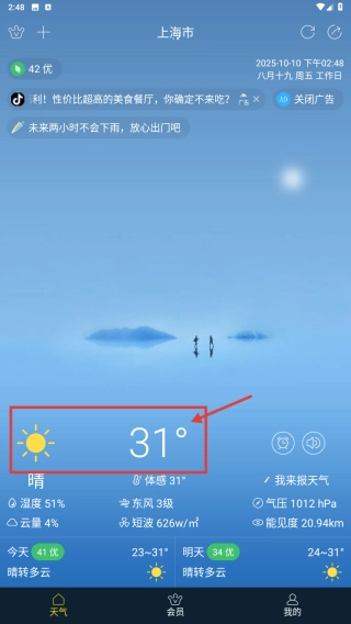 查看上海市的天气情况,结果显示天气晴好,气温为31摄氏度,湿度51%,同时伴有3级东风。