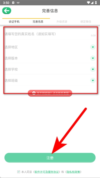 在完善信息的页面中,填写真实姓名、班级等相关信息,之后点击注册按钮,即可完成账号的注册流程。