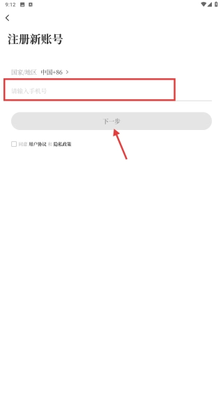 在新账号注册页面,输入手机号码并点击下一步按钮,即可完成注册流程的首步操作。