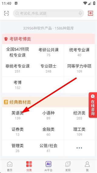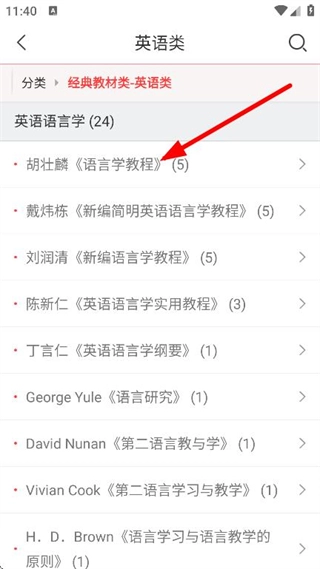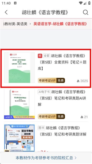 在英语类内容页面,找到并点击《胡壮麟语言学教程》,即可进入该教材的相关资料页面。