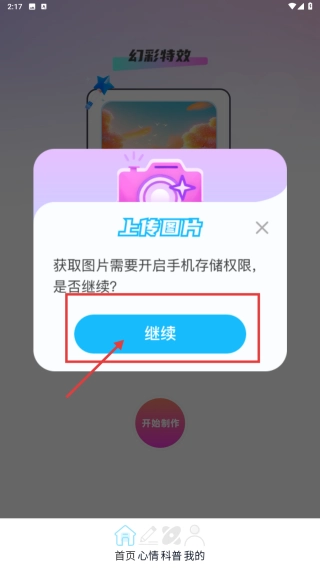 当权限弹窗出现时,点击“继续”按钮以开启存储权限,这样就能上传图片来制作特效了。