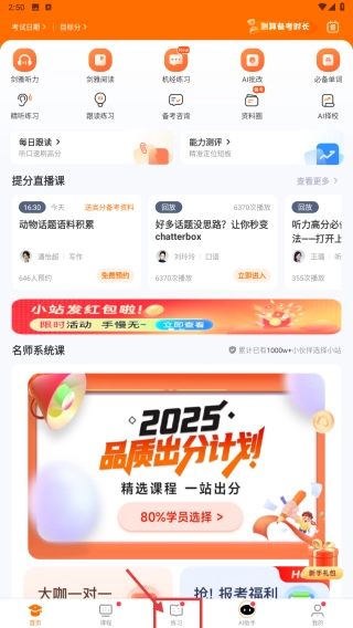 打开雅思学习应用,点击底部的练习选项,即可进入练习功能页面。