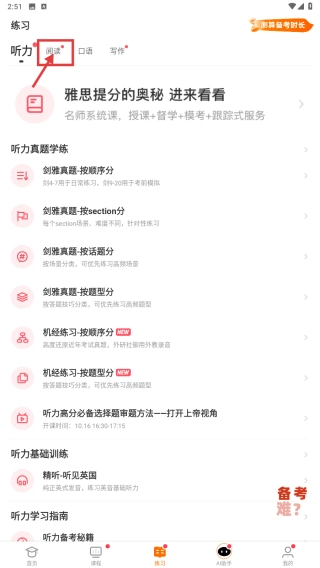 在练习页面,选择阅读板块,浏览阅读提分资源。