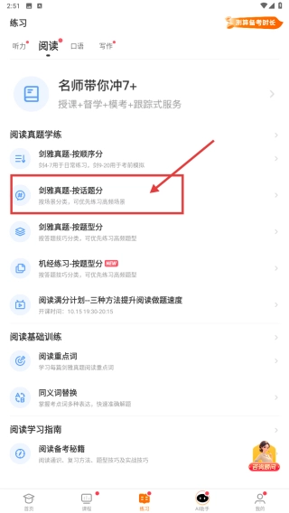 在阅读提分的资源板块里,找到“按话题提分”这个栏目并点击,就能进入话题练习的列表页面。