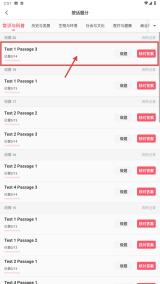 在话题练习列表中,挑选Text-Passage 3的练习内容,启动阅读提分训练。