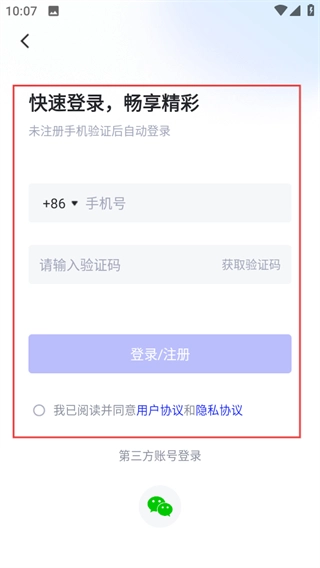 在登录页面,输入相关信息并同意协议后,点击登录注册按钮,即可完成登录操作。