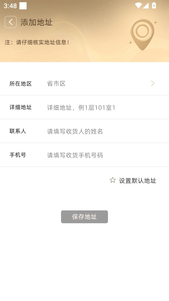 6.用户依次填写所在地区、详细地址、联系人及手机号码后,点击“保存地址”按钮,即可完成该操作。