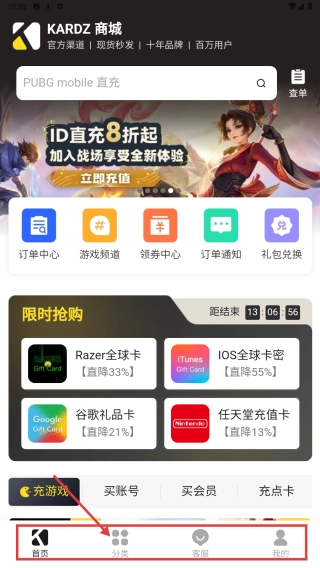 打开KARDZ商城应用,点击底部的分类选项,即可进入商品分类页面。