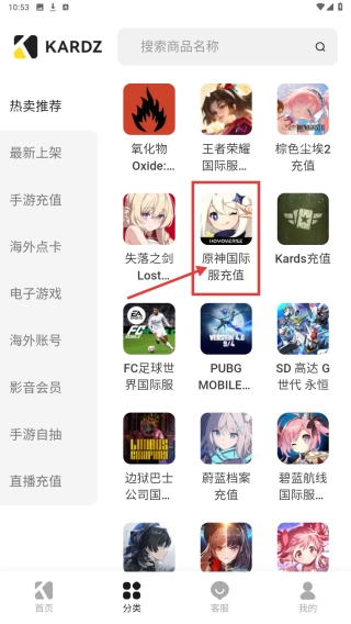 在商品分类页面里,找到原神国际服充值的分类,点击进入这个分类的详情页面。