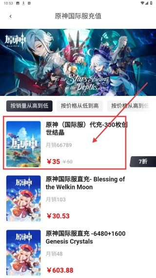 在分类详情页面,找到并点击“原神国际服代充-300枚创世结晶”这款商品,然后查看对应的充值详情信息。