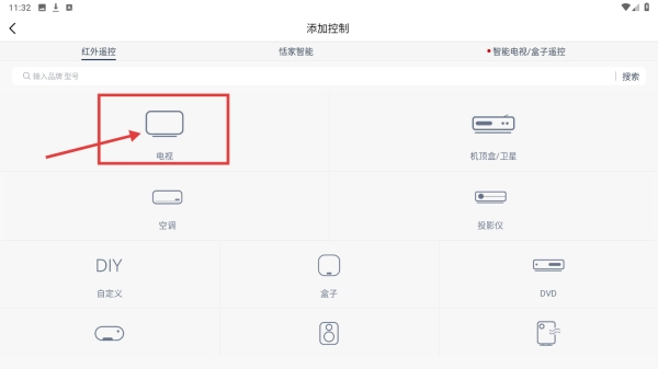 在添加控制页面,点击电视选项,进入电视品牌选择页面。