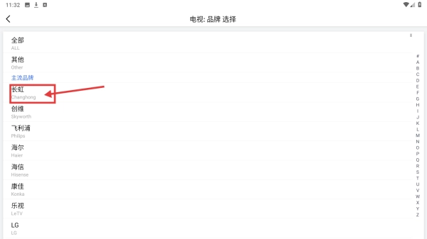 在电视品牌选择界面,点击长虹品牌,完成电视遥控器的添加配置。