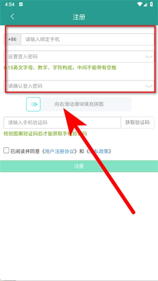 请输入需要绑定的手机号码,接着设置登录密码并再次确认该密码,最后向右滑动滑块以完成拼图验证步骤。