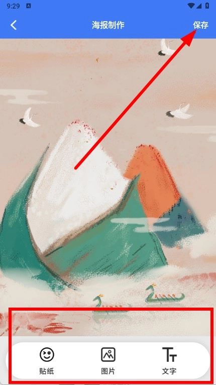 用工具对海报进行编辑操作,编辑完毕后点击右上角的保存按钮,就能把制作完成的海报保存下来。
