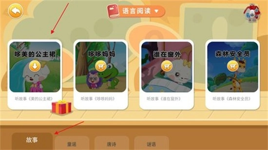 3. 进入语言阅读板块,点击【故事】选项,接着在故事页面选择一个你感兴趣的故事并点击。