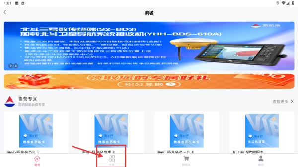 进入首页后,您可以浏览北斗三号数传终端等海事相关产品的宣传内容,也能查看自营专区以及各类海员卡等商品。