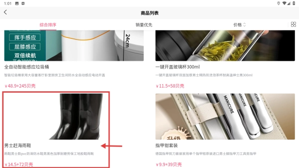 在商品列表里,能找到男士过海雨鞋这类日用百货商品,还可以查看它们的价格信息,比如男士过海雨鞋的价格是¥14.5加上2贝壳。