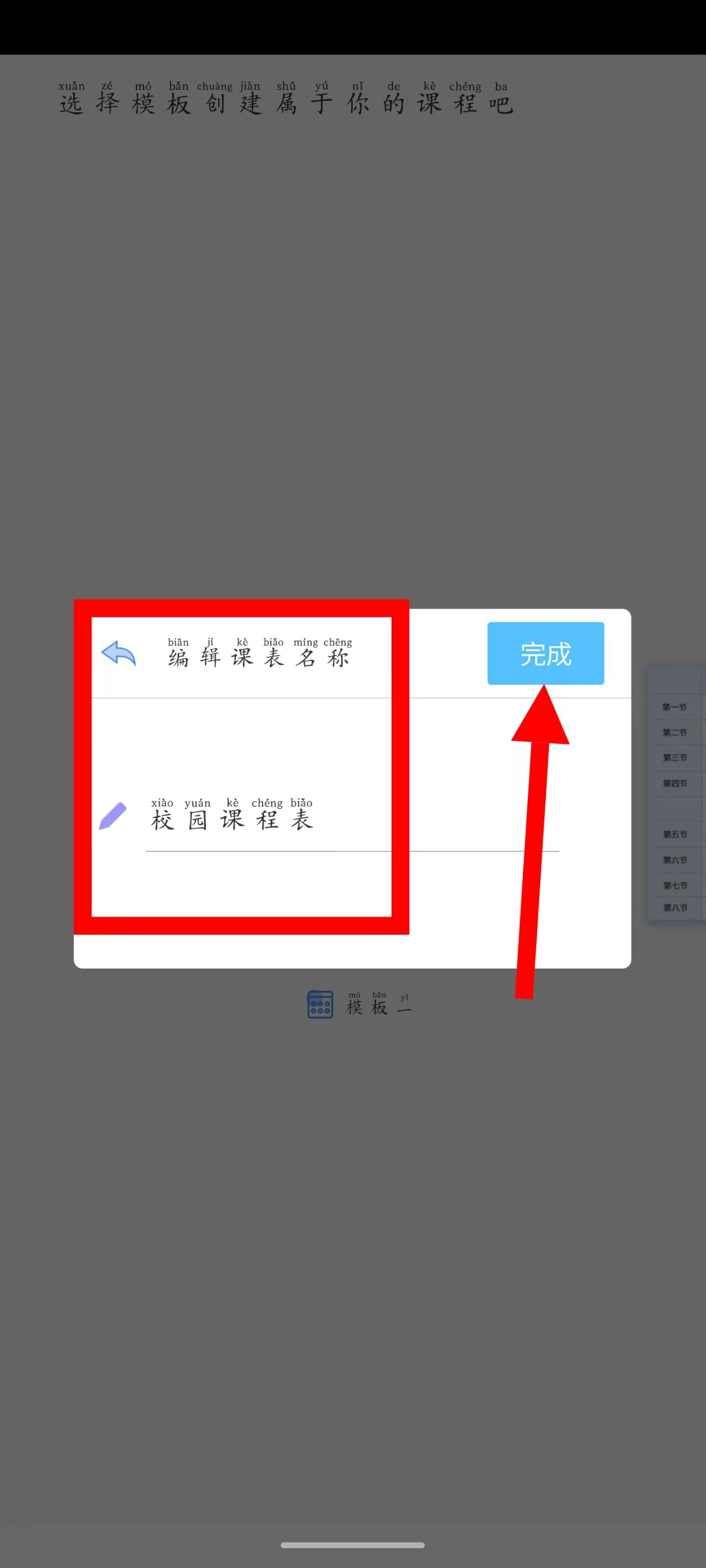 当编辑课表名称的弹窗弹出后,您可以确认当前的课表名称,也可以对其进行修改,之后点击完成按钮,即可完成课表的创建。