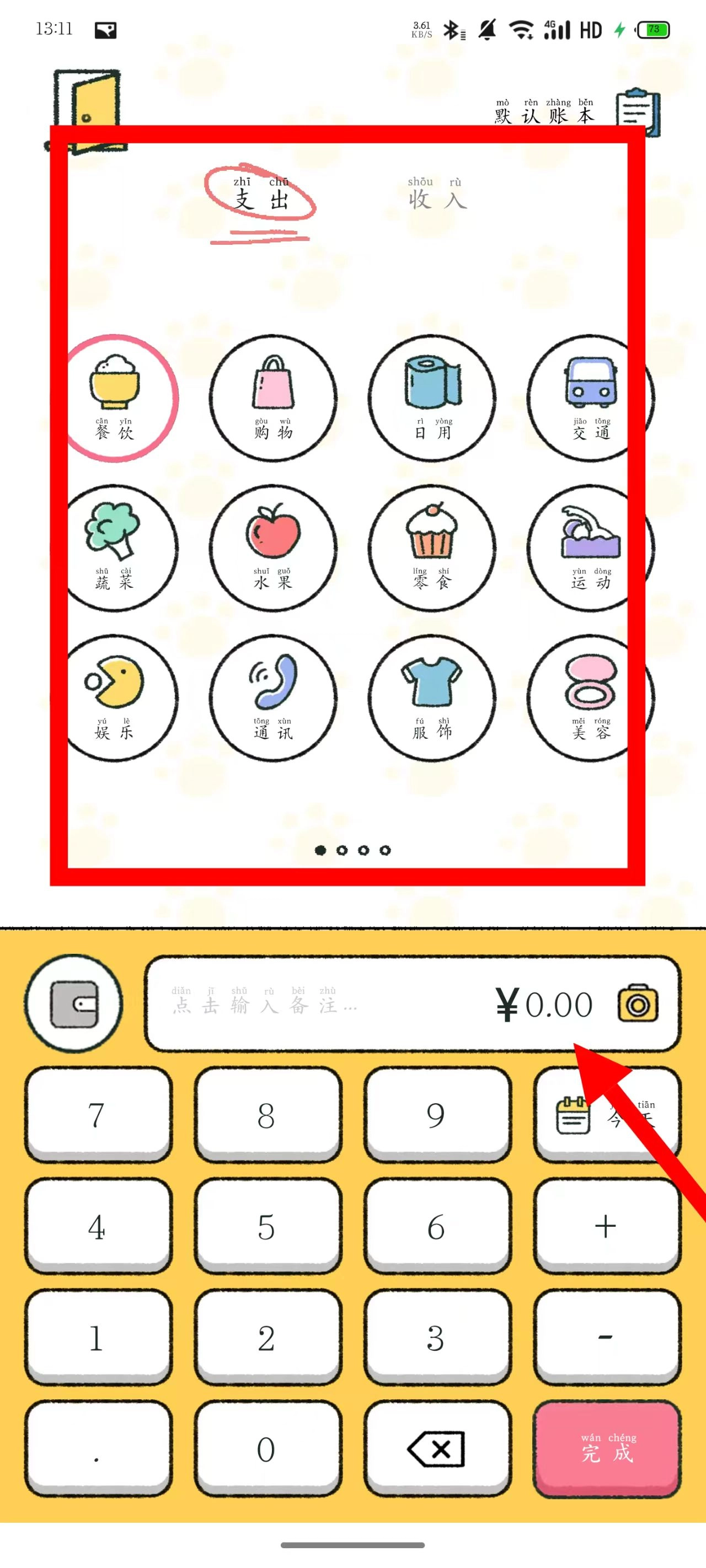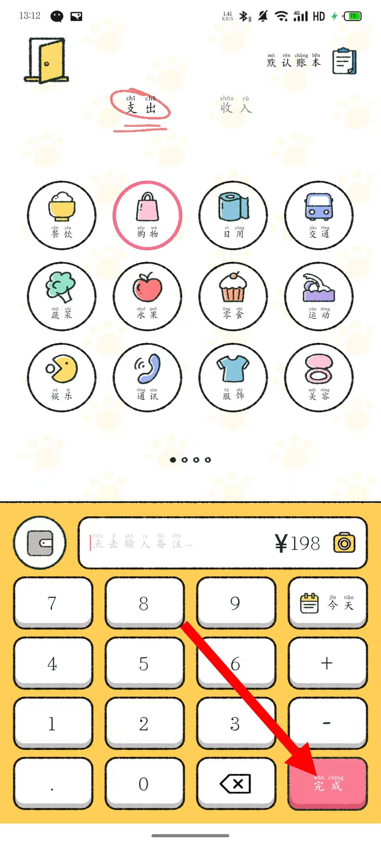 输入支出金额,点击完成按钮,完成购物支出的记录。