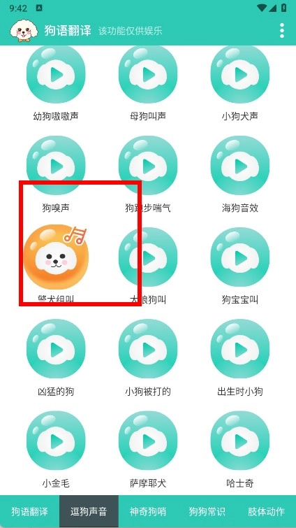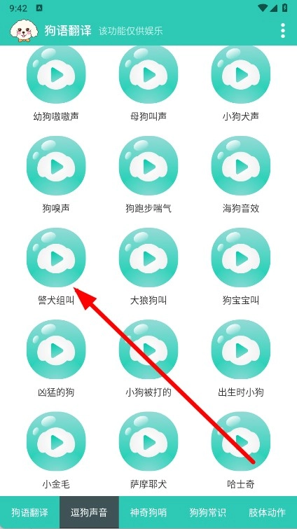 点击底部导航栏的逗狗声音选项,即可进入逗狗声音选择页面。