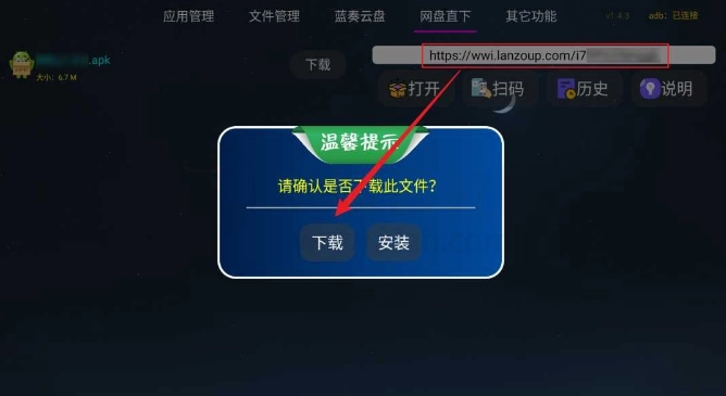 2.提取的apk应用默认放在“内部存储---Download”文件夹之下;蓝盘功能仅拉取蓝盘界面的登录API而已(如有顾虑可不用,但确实方便);遥控器方向键移动位置,确认键长按某个文件(夹)可弹出文件菜单,亦可搭配无鼠体验更佳。