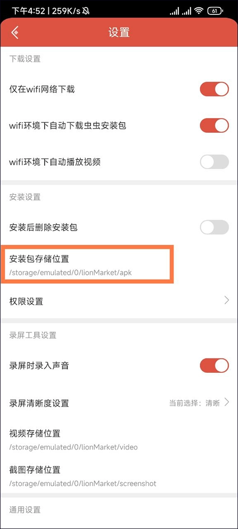 3、进入设置界面后,能查看到游戏安装包在手机里的具体存储位置,我们把这个位置记录下来。