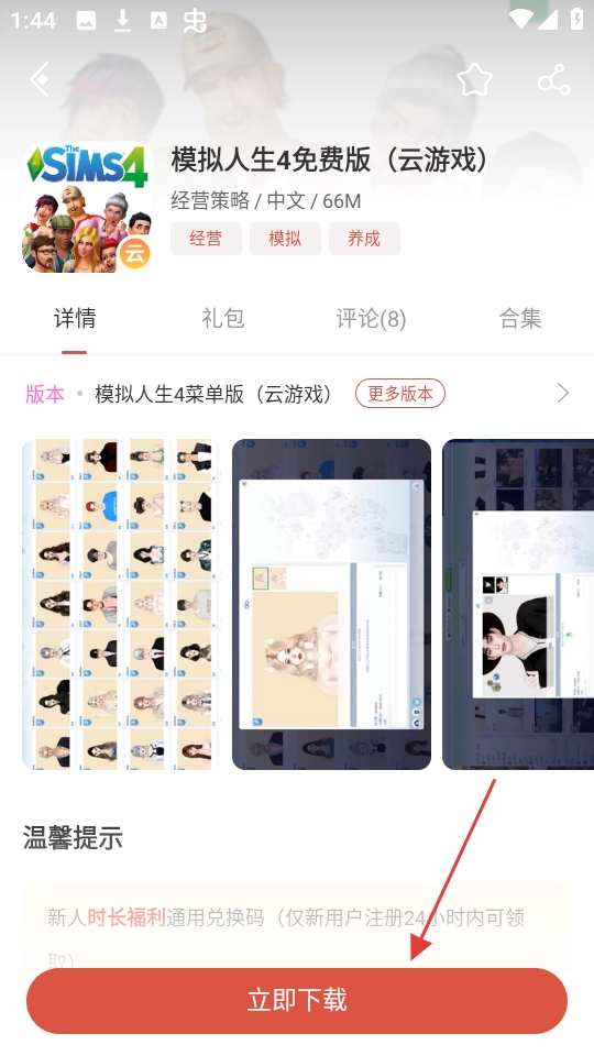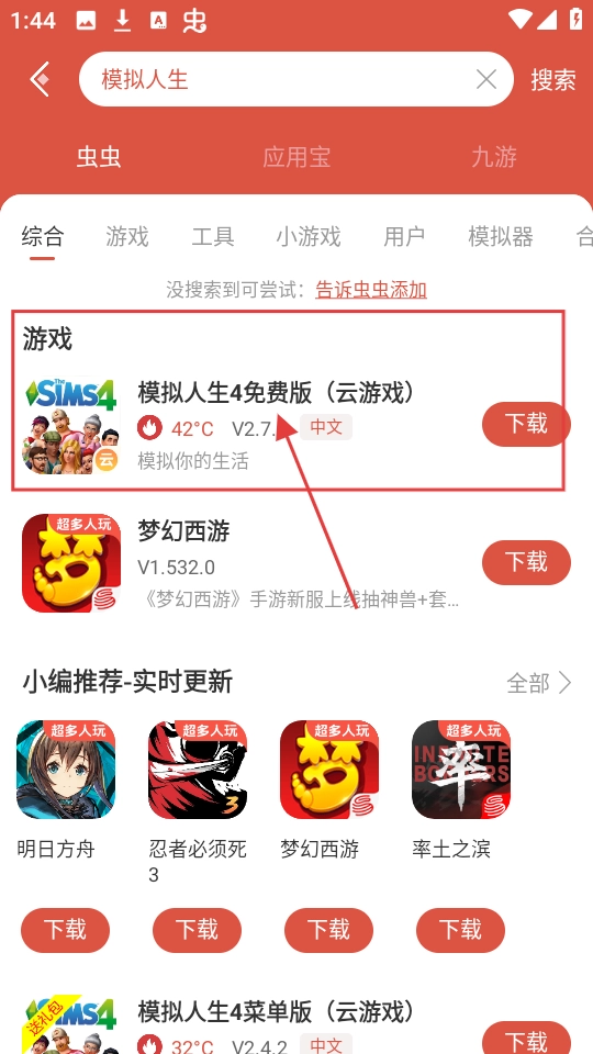 3、在搜索结果里,找到你想玩的游戏,像“模拟人生4免费版(云游戏)”这类,点击该游戏即可进入对应的游戏详情页面。