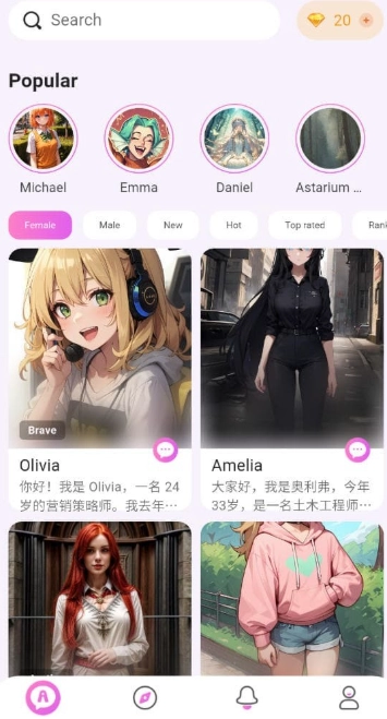 结构化角色发现广场的核心探索路径由“Discover”和“Search”两个页面组成。“Discover”页面主打个性化推荐,“Search”页面则设置了“Female/Male”性别分类、“New/Hot/Top rated”实时榜单,以及Brave、Kindness等特色标签,帮助用户快速定位当下热门或契合自身喜好的AI角色。