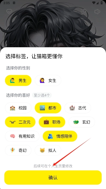 1、打开猫箱AI聊天界面,挑选你的标签,需选择至少4个标签后,点击确认按钮。