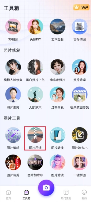 1、打开应用后进入【首页】,接着切换至【工具箱】界面,在图片工具分类里找到图片压缩功能并点击进入。