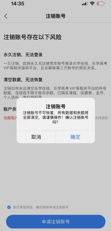 3、在确认账户无余额后,勾选屏幕下方“我已清楚风险,确定继续申请注销账号”的选项,然后点击“申请注销账号”按钮。