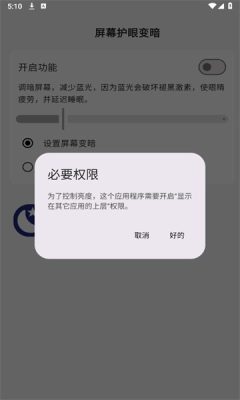 1、屏幕护眼变暗功能需解锁对应权限:请按照提示开启相关系统权限,以便进行亮度调整。
