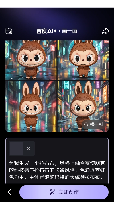 1)创作入口:打开百度 ,搜索「百度 AI拉布布挑战赛」进入活动专区,运用 AI工具为拉布布设计专属造型 --无论是炫酷时装、奇幻场景,还是趣味动态姿态,均可自由定制,让拉布布以全新视觉形象登场!