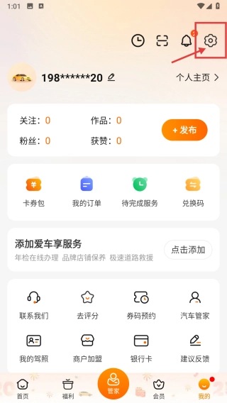 打开车服务类首页,点击底部的“我的”选项,即可进入个人中心页面。