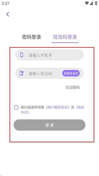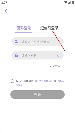 在短信验证码登录页面,依次填写手机号与验证码,勾选相关协议后,即可完成登录流程。