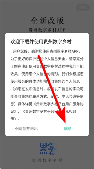 打开贵州数字乡村应用,在弹出的窗口中点击同意按钮,随后进入登录注册界面。