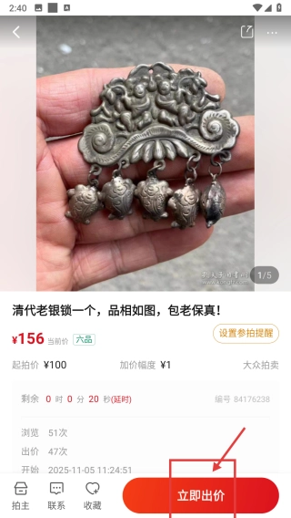 在拍品列表页面,点击“清代老银锁”这一拍品条目,即可进入该拍品的详情页面。