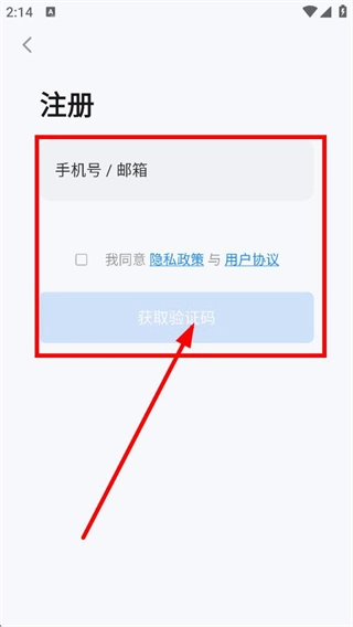 在注册界面,输入手机号或邮箱,同意相关条款后点击获取验证码。